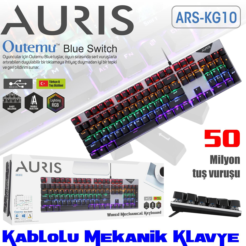 Auris KG10 RGB Işıklı Mekanik Türkçe Q Kablolu Klavye Oyuncular için özel RGB ışıklı tasarım. Ergonomik tasarımı sayesinde el yerleşimi oldukça rahattır. Metal görünümlü sağlam gövdesi şık ve uzun ömürlü kullanım süresi sunar. Outemu Blue siviçleri, uzun süreli yazma seansları için kullanımı çok rahattır. Çalıştırma noktasında belirgin bir dokunsal çıkıntı ile pürüzsüz bir yazma deneyimi sunar ve çok fazla güç gerektirmeyen hassas bir dokunuş hissi sunar. Oyuncular için Outemu Blue tuşlar, oyun sırasında sert vuruşlarla artırılabilen duyulabilir bir tıklamaya ihtiyaç duymadan iyi bir tepki ve geri bildirim sunar. Dokunsal çarpma, tuş vuruşlarını doğrulamaya yardımcı olur ve bu anahtarları hassas girdilerden faydalanan strateji ve rol yapma oyunları için ideal hale getirir. Outemu Blue muadillerinden önemli ölçüde daha sessizdir. Daha derin, daha yumuşak bir sesle, gürültü seviyelerinin düşük tutulması gereken ofis ortamları veya paylaşımlı alanlar için oldukça uygundurlar. Uyumlu İşletim Sistemleri: Windows, Mac, OSX, Linux