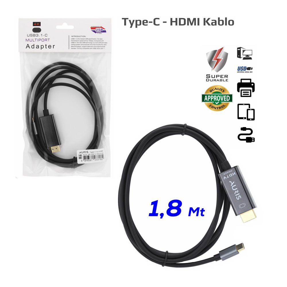 Auris HDMC10 Type-C to HDMI 4K 1.8m Ses ve Görüntü Aktarım Kablosu