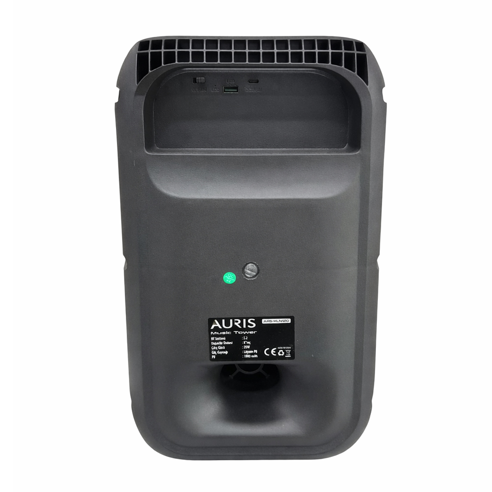 Auris KLN120, 25W yüksek çıkış gücü ve 8 inçlik geniş hoparlör çapıyla güçlü bir ses performansı sunar. RGB renkli ışık efektleriyle görsel bir şölen sunan cihaz, çok yönlü ses teknolojisi sayesinde sesi geniş alanlara etkili bir şekilde yayar. Beraberinde gelen kablolu mikrofonu ile karaoke partileri ve organizasyonlar için mükemmel bir seçimdir. Kompakt tasarımı ve ergonomik taşıma sapı, bu güçlü hoparlörü dilediğiniz her yere kolayca götürmenize imkan tanır. Bluetooth 5.2 teknolojisi ile hızlı ve kesintisiz bir kablosuz bağlantı deneyimi sağlar. Dinamik RGB aydınlatması, müziğin ritmine eşlik ederek bulunduğunuz ortamın enerjisini anında yükseltir. Bluetooth Sürümü: 5.2 Auris KLN120; Bluetooth ve USB girişleri üzerinden müzik çalma desteği sunarken, özel mikrofon (MIC) girişi ile sesinizi duyurmanıza yardımcı olur. Yeni nesil Type-C şarj girişi sayesinde güncel kablolarla kolayca şarj edilebilir. Uzun çalma süresi ve güçlü yapısı ile hem iç hem de dış mekan kullanımları için dayanıklı bir tasarıma sahiptir. • Kablosuz BT HoparlörAuris KLN120 25W Kablolu Mikrofonlu Taşınabilir Kablosuz Bluetooth Hoparlör