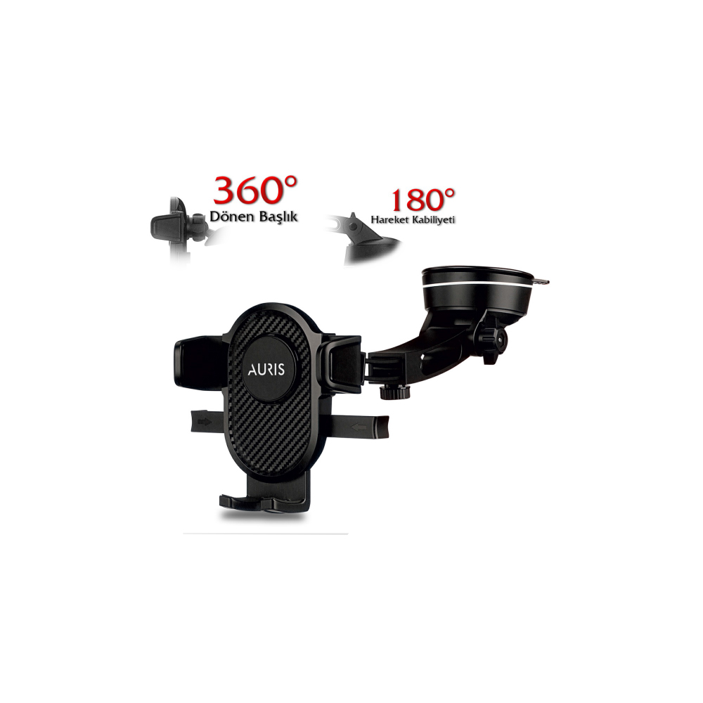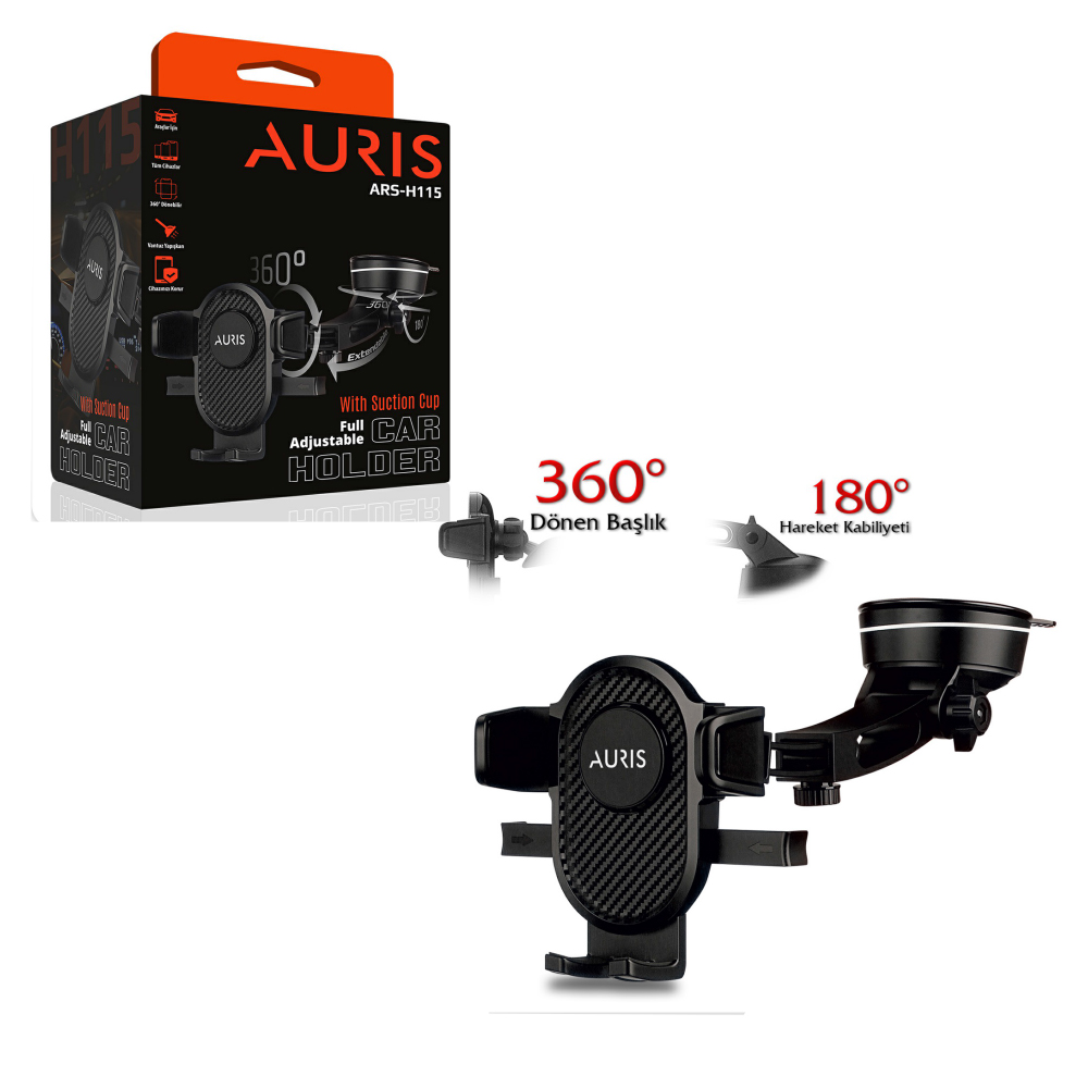Auris H115, süper yapışkan vantuz teknolojisi ve tam ayarlanabilir teleskopik kol yapısı ile telefonunuzu araç içerisinde en ideal görüş açısında sabitler. Tek dokunuşlu montaj sistemi sayesinde cihazınızı sadece parmak dokunuşuyla kilitler, sarsıntısız ve güvenli bir sürüş deneyimi sunar.Auris H115 Boy Ayarlı Vantuzlu 360° Döner Araç İçi Telefon Tutucu